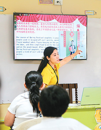 r日前,在位于菲律宾棉兰老岛北苏里高省的孙逸仙小学四年级的课堂上,校长兼中文老师王建生说起春节和饺子,课堂立刻热闹起来。